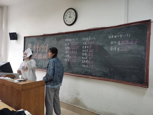 投票过后,班长田园进行收集整理,并现场唱票,将结果公平公开公正地展现在大家面前。最后经过计票统计得出结果,此次党团推优活动推选出入党积极分子黄慧敏、王俊飞、邓玉慧,优秀团员战美、黑丽莎,优秀团干部蔡博文。