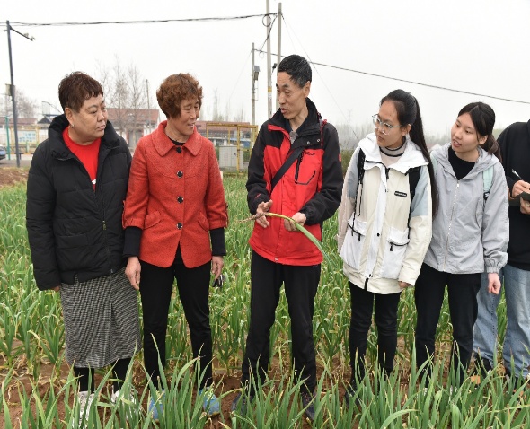 实践团在教师徐振彪博士带领下,来到了大蒜种植地,在田间地头认真查看植株生长情况,为进一步优化高产大蒜种植技术实地采集相关数据。