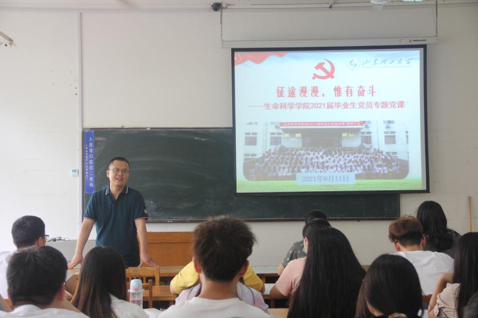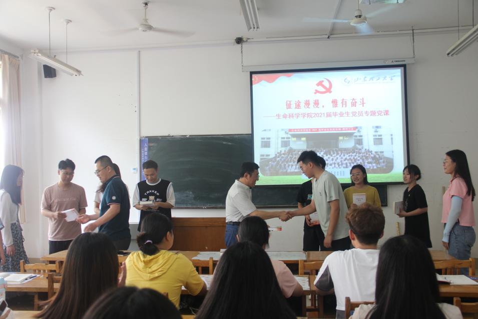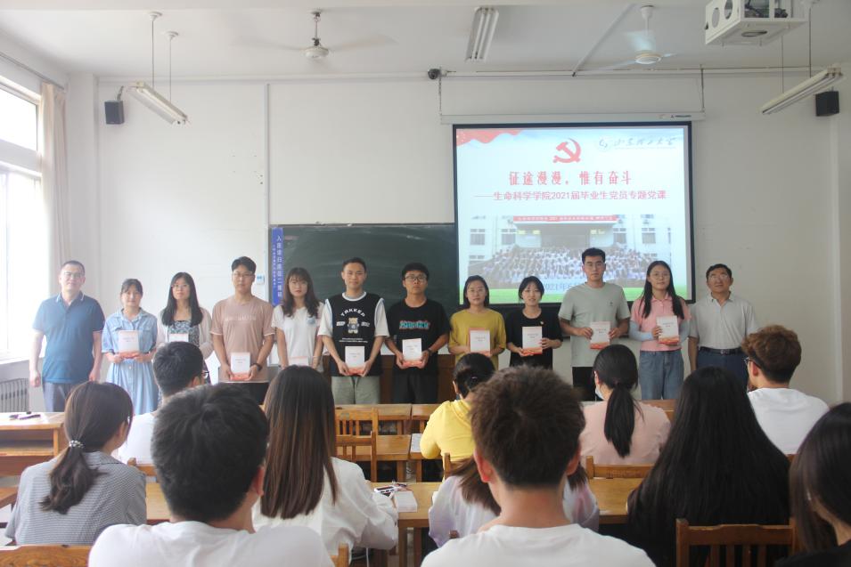 6月11日下午,生命科学公司毕业生党员专题党课暨赠书仪式在13号教学楼202室举行。公司党总支书记郭万保、党总支副书记陆广峰、全体辅导员和毕业生党员参加活动。陆广峰主持活动。