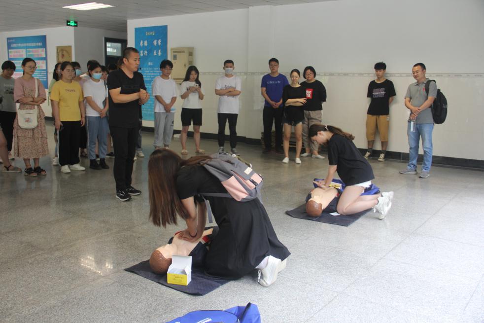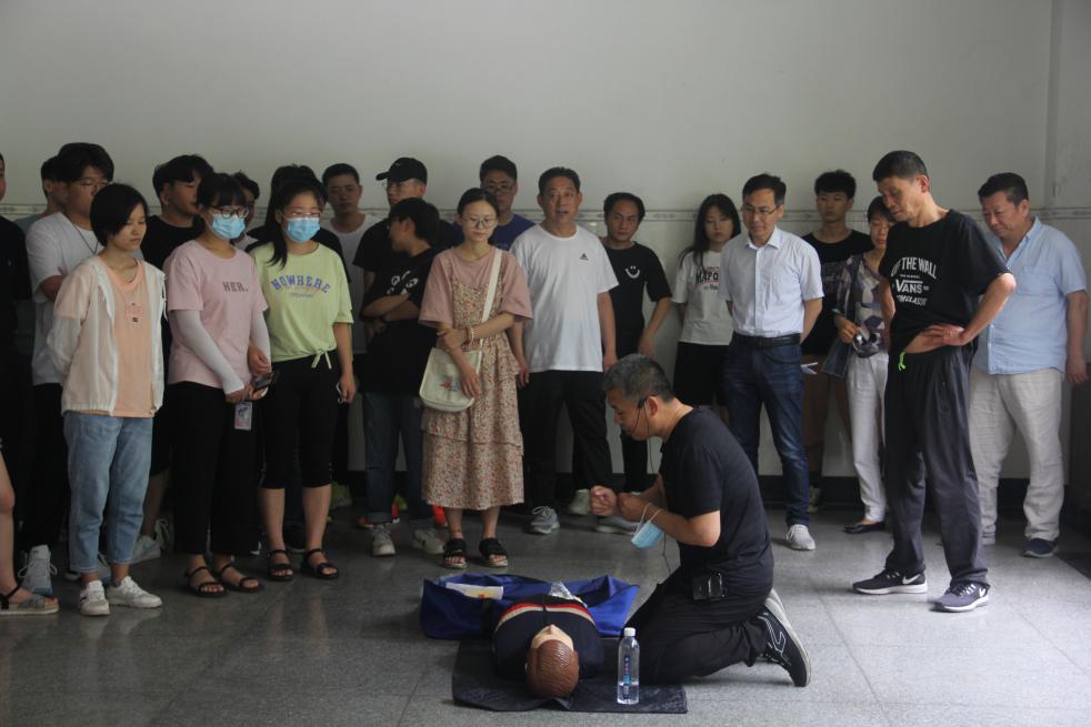 应急抢救演练中,张敏详细讲解了应急救护的方法步骤,在校医院相关人员的协助下,现场就心肺复苏操作邀请并指导师生进行了示范演示。部分师生随后在工作人员指导下进行了实操学习。