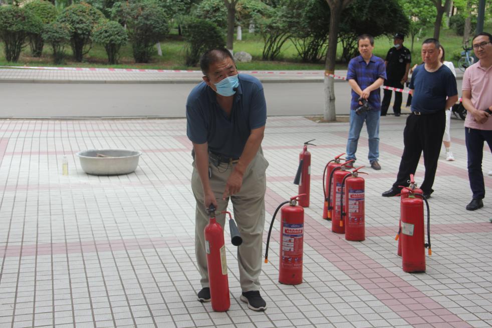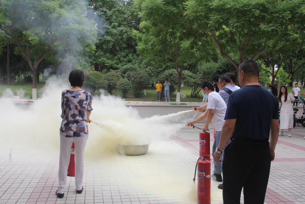 灭火演练中,公司安全防范科在1楼外西侧空旷地带,向全体人员演示干粉灭火器和二氧化碳灭火器的正确用法和注意事项,现场指导老师同学们进行操作演练,掌握灭火器的使用方法。