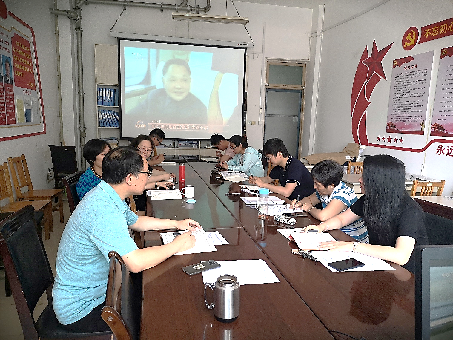 会议首先围绕“凝心聚力学党史、砥砺前行强党性”的主题,观看了七届二中全会、中共八大、十一届三中全会的相关视频资料。1949年3月5日—13日,中国共产党在西柏坡举行七届二中全会。会议着重讨论了党的工作重心的战略转移,即工作重心由乡村转移到城市的问题。首次提出加强党的建设,提出“两个务必”——务必使同志们保持谦虚谨慎不骄不躁的作风、务必使同志们保持艰苦奋斗的作风。中共八大于1956年9月15日至27日在北京政协礼堂召开,是建国以后中国共产党召开的第一次全国代表大会,提出了社会主义建设的伟大任务。1978年12月18日至22日在北京举行的十一届三中全会实现了建国以来党的历史的伟大转折:实现了思想路线、政治路线、组织路线的拨乱反正;开始了系统清理重大历史是非的拨乱反正;恢复了党的民主集中制;做出了实行改革开放的新决策,启动了农村改革的新进程。