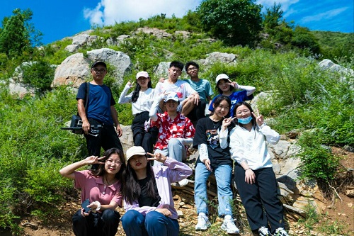 随后,成员们在刘国峰的带领下,前往大山深处,探寻抗日战争所存留的历史遗址。在登顶的路上,刘国峰老师向成员们介绍了沿途的植物,并用相机记录下了成员们爬山的过程。成员们从山顶望去,下小峰村尽收眼底,伴随着清凉的山风,成员们不禁感叹“会当临绝顶,一览众山小。”