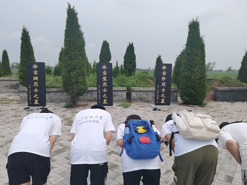 接着两位党员带领实践团队成员祭拜三烈士墓。一门三英烈声名永流芳,大哥徐宝珊,三弟徐宝璧,五弟徐宝珍。“一门三烈士,兄前扑,弟后继,抗战救国,堪同杨门媲美;七子尽英豪,屋俱焚,财充响,毁家纾难,可与子文齐芳。”他们的事迹在当年的中国大地的每一处都在上演,几万万中华儿女为抛头颅,洒热血,挥汗水,劳心血。为民族独立,国家复兴而奋斗。在中国这方热土上,有无数仁人志士为了民族的解放,国家的独立和人民的幸福,抛头颅,洒热血,谱写了一篇篇悲壮激越的历史篇章。