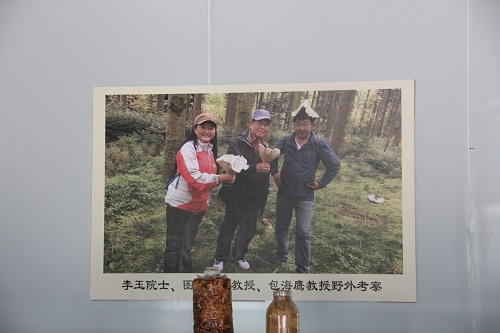耿俊菊向实践团重点介绍了李玉院士与包海鹰教授到德州夏津桑黄基地实地研究桑黄的事迹。她还展示了由李玉院士与包海鹰教授的著作——《中国菌物药》。书中说到古代本草中记载的桑黄与现代当地桑黄形态特征相符。在形态方面,古书记载与实体颜色一致;在药用功效方面,古书记载桑黄的主治疾病与现代很多病症相似,与现代药理作用有相同之处。所以认为粗毛纤孔菌应该是真正古代本草中记载的中药桑黄。