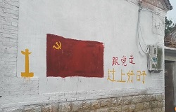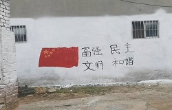 “永远跟党走”、“跟党走,过上好日子”、“共产党万岁”、“富强、民主、文明、和谐”等字样使村庄的红色文化特征愈加明显,一笔一画都表达着成员们和村民对党、对祖国的忠诚和热爱。党旗、国旗、天安门前的华表等形象十分生动,浓烈的大红色是一颗颗滚烫的爱国心,也是一腔又一腔沸腾的报国热血。这些代表着“红色精神”的画作既是对村中18位革命烈士的缅怀,也表达了成员们对村中老党员爱党精神的敬佩。