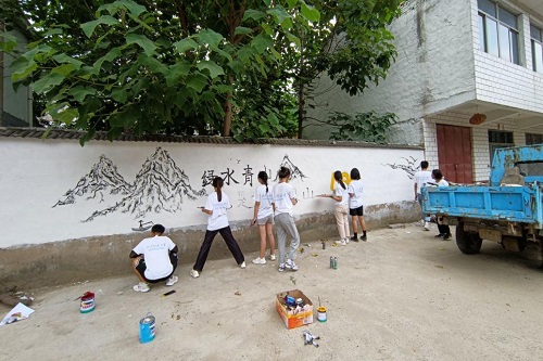 7月26日至27日,谈球吧网页版登录入口“七月蜜‘峰’”实践团为下小峰村庄绘制墙绘。