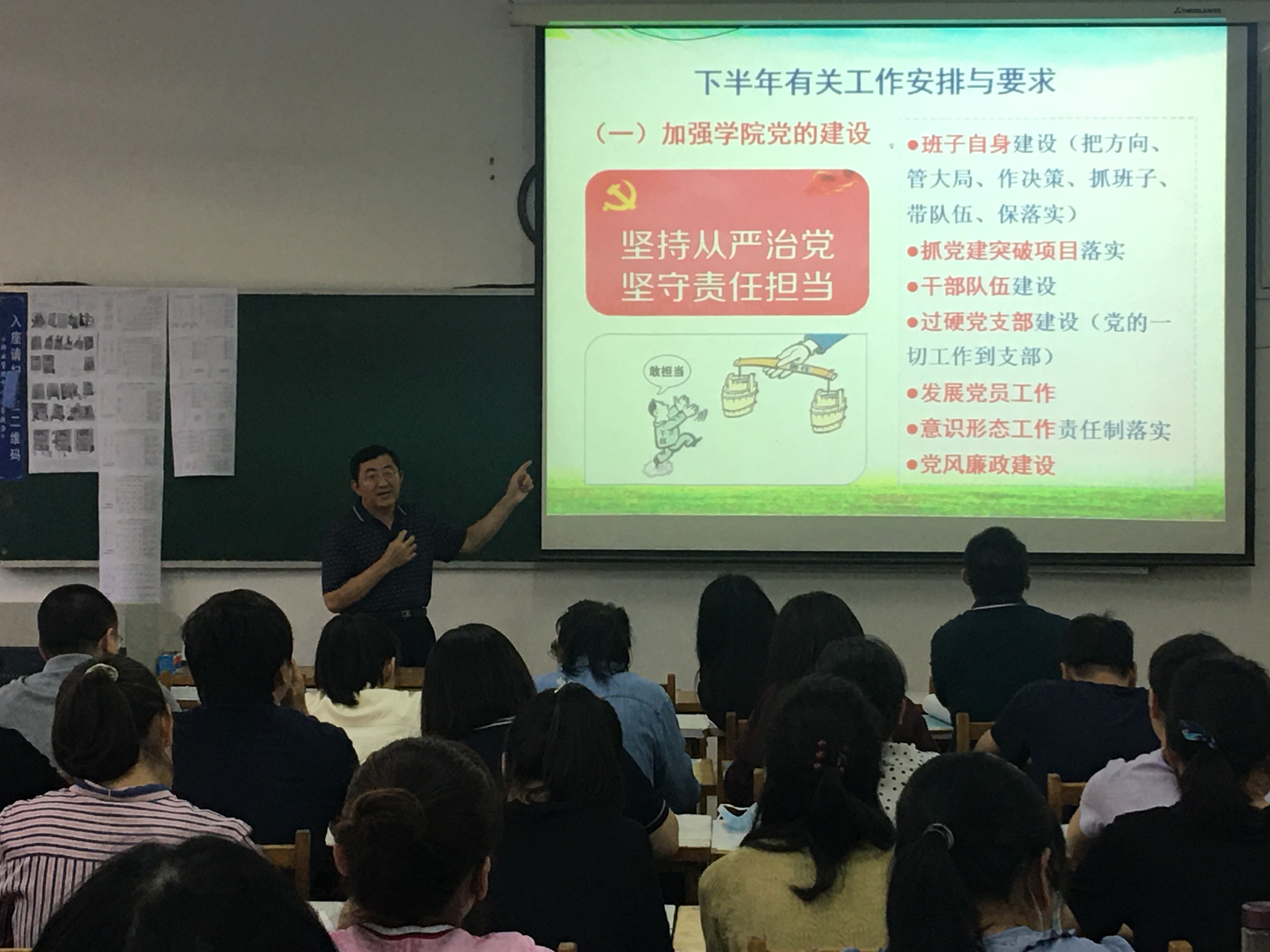最后,郭万保从加强公司党的建设、深化师生思想教育、推进重点工作落实、落实落细安防措施等4个方面,对下半年党建思政及公司整体工作做了安排部署,要求全院教工把公司更名作为个人提升和特色强院建设新起点,勠力同心,携手共进,开创公司建设发展新局面。他还就即将到来的第37个教师节,代表公司向全体老师表示感谢,并送上节日祝福。