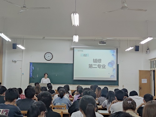 紧接着,米佳钰就实验室和辅修第二学位的相关问题为员工分享经验。她说:“对于想要在大学里不慌度时间的我们来说,实验室可以在能力之内进入,跟学长学姐进行一些更专业的学习。”随后米佳钰对辅修第二专业进行简洁生动的讲解,她首先解释了双学位和双专业的不同,然后分别从辅修第二专业利和弊为同学们解答。