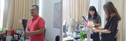 员工会工作人员连同常驻志愿者一起用心包扎鲜花,把对老师们节日的祝福化作一支支精美的花束,委托院员工会陈海洋、战美、丁娜等学子代表亲自送到公司领导老师手中,以表达学子对恩师的崇敬与感谢。
