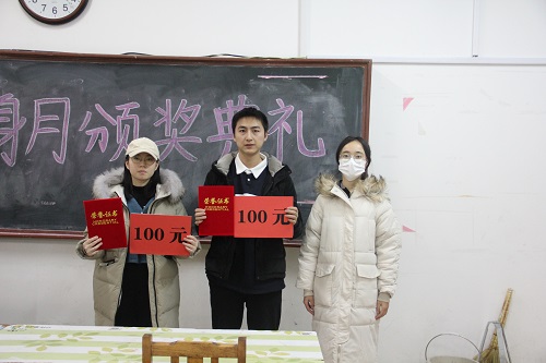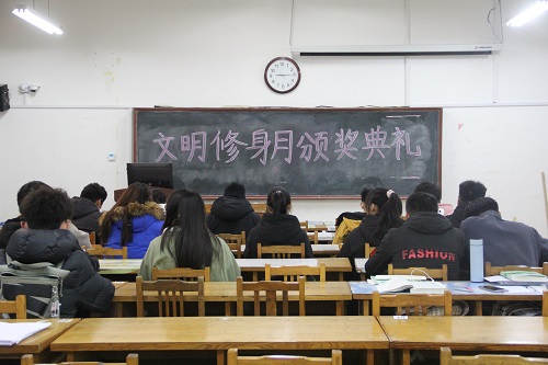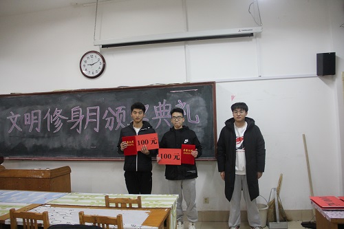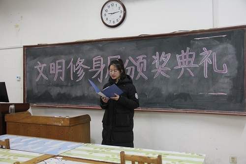 随后,各班代表上台领奖。战美为文明修身进宿舍的班级和文明修身进课堂的班级颁发获奖证书和奖品,陈海洋为文明修身进校园的班级颁发获奖证书和奖品并作总结讲话。他对获奖班级表示祝贺并表扬活动启动以来各班级的踊跃参与,他倡导大家要以文明为底色,让文明之花开遍山理工,做天天向上的文明青年。台下响起热烈的掌声。