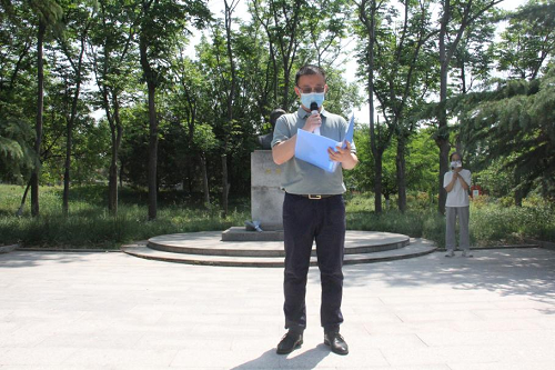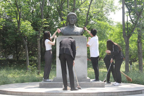 员工代表擦拭冯思广雕像,清扫冯思广雕像周边杂物,并敬献鲜花,以表缅怀之情。