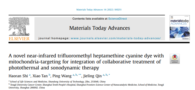 近日,公司抗衰老与再生医学研究所的免疫与再生研究团队2020级硕士研究生石浩然首位在光声治疗肿瘤方面取得重要进展,相关成果以A novel near-infrared trifluoromethyl heptamethine cyanine dye with mitochondria-targeting for integration of collaborative treatment of photothermal and sonodynamic therapy为题首位发表在Materials Today AdvancesIF:9.918)杂志上。