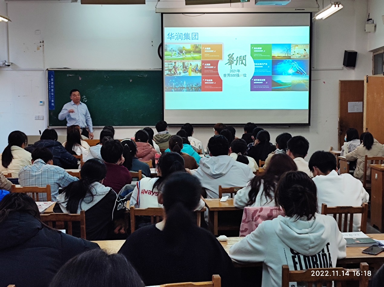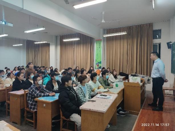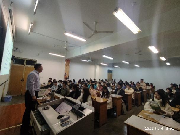 柳吉介绍了华润圣海健康科技有限公司的基本情况,结合自身的学习成长经历,与同学们进行了亲切的交流互动。他首先提出了”大学是一个人的大学,高中是一群人”的观点,以提醒大家要明确大学的学习生活与之前的任何一个时期都不一样。特别是对于大一新生来说,要及时调整学习方法与模式,以最佳状态面对大学学习。他分享了个人从公司毕业后加入华润圣海健康科技有限公司的职场发展经历,并指出,未来的工作也许会与当前专业的学习不同,但不论是什么工作,都应该努力坚持下去,不轻言放弃,坚持总会收获成功。他强调,当下机会总是少于人才的,要学会把握机会,积极争取机会。围绕 “机会”这个话题,他还现场通过小游戏调动课堂气氛,帮助大家深切理解何为“把握机会”。同时,他还对新生学好专业提出了个人建议,对生物科学专业当下的就业发展情况做了介绍,并结合具体事例,鼓励大家要拓宽思维与眼界。他专门围绕毕业生如何择业给出了个人分析,并做了具体指导。最后,他希望全体同学都能提前做好人生规划,从而更好把握成长机遇,在同等的时间里创造出更大的价值!