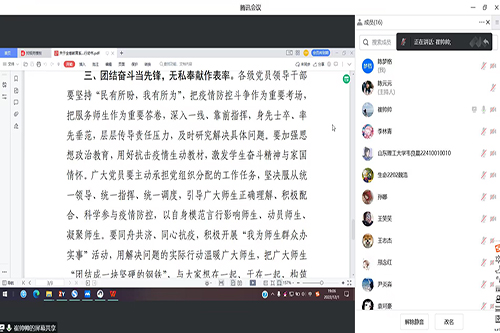 崔帅帅从学习文件中的提到的三个主要方面为与会党员解读了关于全省教育系统各级党组织和广大党员在疫情防控工作中当先锋作表率的行动书》。崔帅帅强调,作为研究生党员,要注意做好日常的防疫工作,共同配合公司防疫政策,更要以身作则,提醒周围的同学做好自身防护,在关键时期积极发挥党员的先锋模范作用。