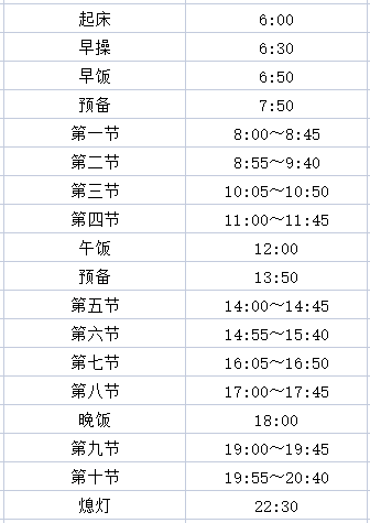根据教代会、学代会提议,为增进教学资源共享,提高课堂教学效率,经公司研究决定,对课堂教学时长进行调整,每节课堂时长由原来的 50 分钟调整为 45 分钟,上下午大课间时间延长至25分钟,新学期伊始执行新的教学作息时间(下图),请各相关单位根据新的作息时间表做好教学安排。