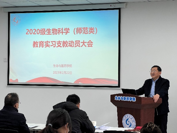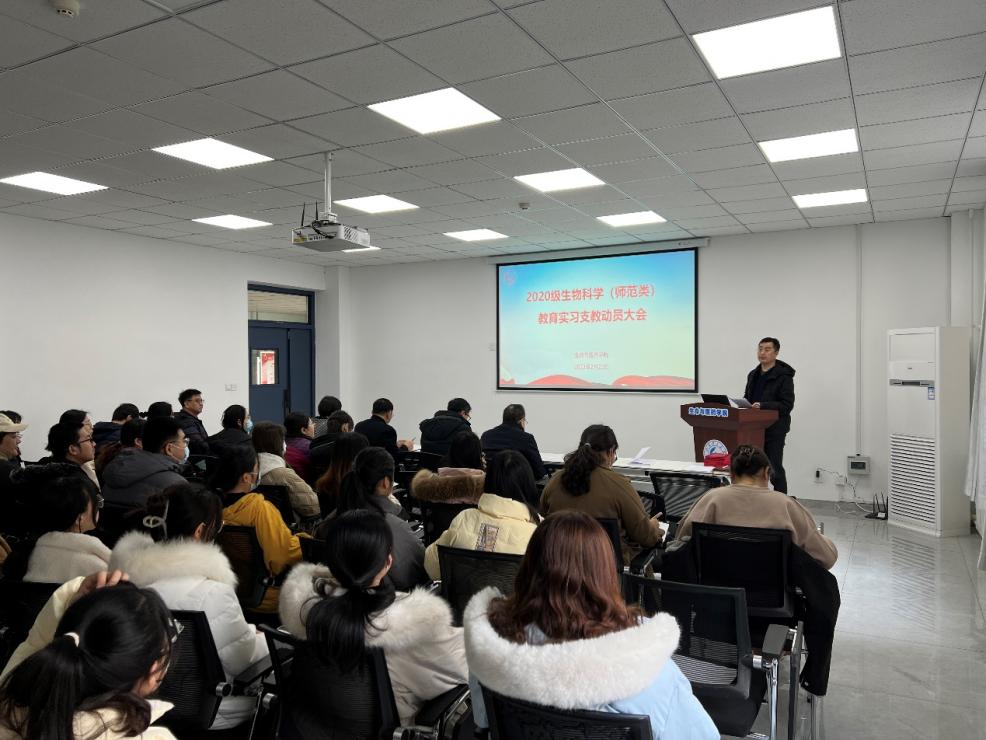2月22日,生命与医药公司在13号教学楼215报告厅举行了2020级生物科学(师范类)教育实习支教动员大会,淄博实验中学办公室主任范亮亮,公司党总支书记郭万保、副经理巴连良、副经理邓洪宽、经理助理徐佳宁,生物科学系党支部书记李超群、主任张建勇,以及实习指导教师、生物科学(师范类)专业2020级全体员工参加,会议由邓洪宽主持。