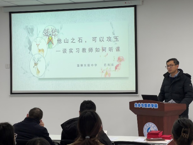 范亮亮以“他山之石,可以攻玉——谈实习教师如何听课”为题,为与会师生作了精彩的报告。他从角色转变、身份认同、教育理念、听课技巧等方面给同学们进行讲解,同时通过分享自身案例增进同学们对实习的认识。