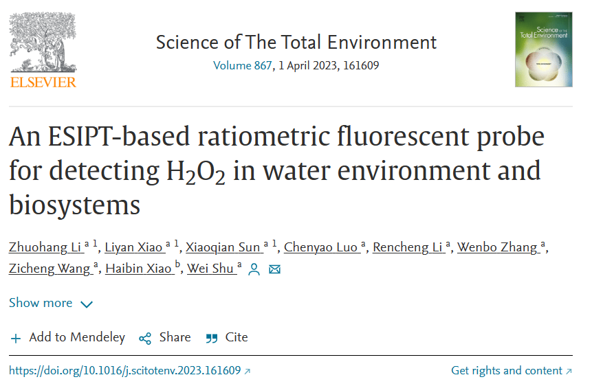 近日,公司生物科学专业2020级本科生李卓航首位在国际知名期刊《Science of the Total Environment》(中科院一区TOP期刊,IF=10.753)发表了题为《An ESIPT-based ratiometric fluorescent probe for detecting H2O2 in water environment and biosystems》的学术论文。教师舒伟为论文通讯作者,谈球吧网页版登录入口为唯一通讯单位。