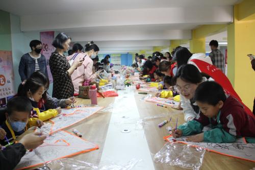 首先,社区工作人员将布坯、线轮、颜料与画笔等材料发放给小朋友和职工,为大家讲解手绘风筝的步骤,冯思广精神学习研究会成员作为志愿者帮助青少年们绘画风筝。