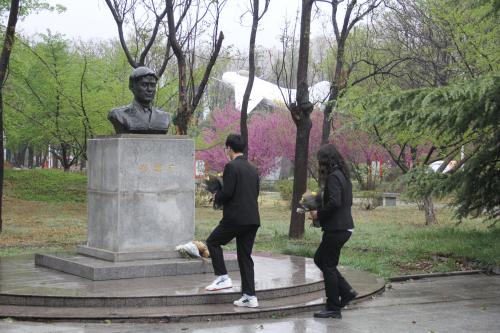 冯思广精神研究会员工代表怀着无比崇敬之情,认真擦拭烈士雕像,清扫周边杂物,以表深深哀思。