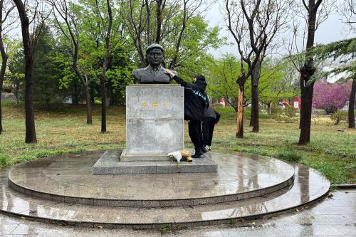 冯思广精神研究会员工代表怀着无比崇敬之情,认真擦拭烈士雕像,清扫周边杂物,以表深深哀思。