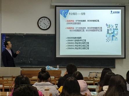 会议伊始,石老师介绍了生物类专业的就业方向和范围,并将将考研专业分为高适配专业和中适配专业,着重讲解高适配专业——生物与医药。随后以江南大学等院校为例,介绍了食品与科学等适配专业。他区分了学硕和专硕,列举了近五年的专业课命题变化趋势。他讲到,“提高学历是最稳赚不赔的投资。”以国家公务员招考为例,硕士学位的公务员岗位需求量大,并提到不同城市对不同学历的优惠政策,鼓励同学们积极备考。