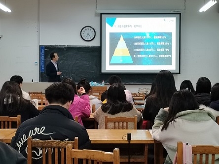 接着,石老师分析了目前考研形势,从报考人数、硕士点分布及招录、竞争对手情况等方面入手,深化了同学们对考研的认识。最后,他着重讲解了院校专业选择,从专业范围和硕士类型入手,锁定意向专业和意向地区,确定意向硕士点,进行竞争难度和自我竞争力分析,最后确定目标。会后,以抽奖的形式赠送了五本考研书籍和其他英语资料,为参会员工送上考研祝福。