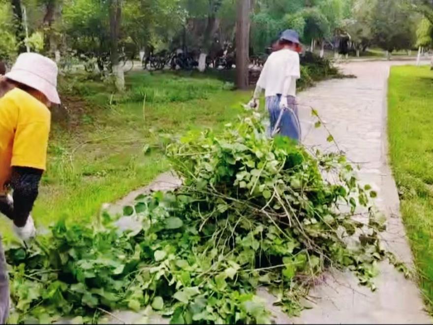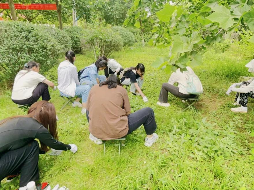 夏日的绿,在天地间挥毫泼墨。背后,是夏天,是似火的骄阳;眼下,是青春,是眼底的汗水。生教2201班的同学们坐在小马扎上用双手拔掉花园草丛的杂草进行公司绿化养护,美化校园环境。