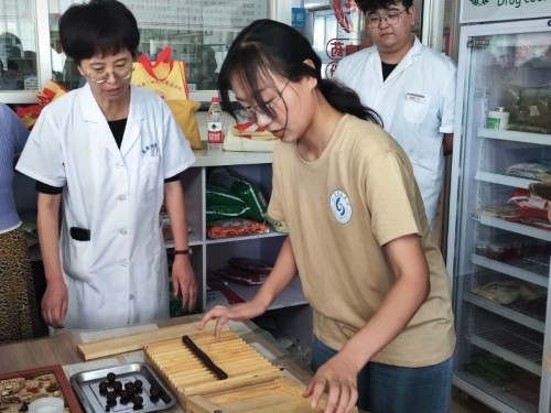 “工欲善其事,必先利其器,器利而后工乃精。”实践团和药剂师一起现场炮制了大蜜丸。包括“药物的打粉/熬胶”→“炼蜜”→“和药”→“搓条”→“推丸”→“整丸子”→“包装”等步骤。将熬炼好的蜂蜜用勺子倒入药粉内,同时快速搅动,边倒蜂蜜边调药粉。之后将丸块制成粗细适当的丸条并将丸条放于子板上,母板与子板交错放置,来回均匀用力挤压成丸状。监测丸重差异,将不规则的丸子筛选修整后进行包装。