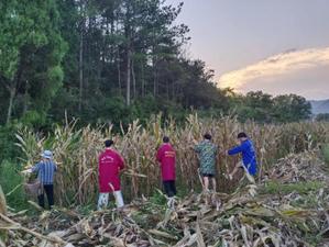 临近傍晚,老奶奶穿戴整齐,带着同样穿戴整齐的实践团成员去往了一片玉米地。落日尚有余晖,黑暗还未到来,实践团趁此时间忙着摘收起玉米。枝干上的玉米棒被剥开外衣,显露出原本隐藏的玉米粒,金黄色的玉米粒被金色的余晖照耀的熠熠生辉,少许的汗水被挥洒在大地上。在月亮升起之时,老奶奶与实践团成员满载而归,在一片欢声笑语中,三个装满玉米的袋子被抬回小院。