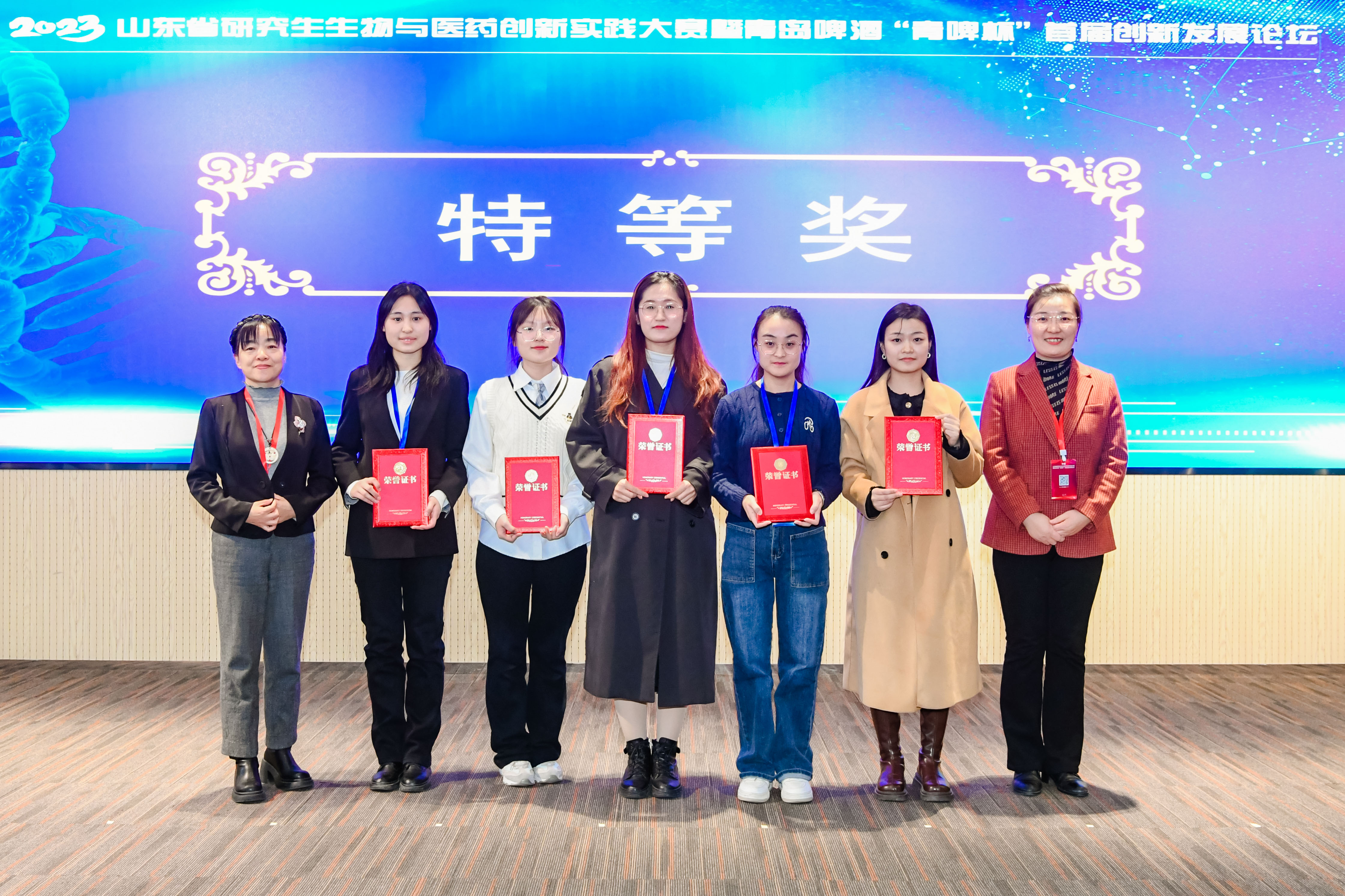 近日,2023年山东省研究生生物与医药创新实践大赛暨青岛啤酒“青啤杯”首届创新发展论坛在青岛大学会议中心圆满闭幕,来自山东省众多高等学府的38支队伍、近200名精英选手参与了此次盛会。经过层层选拔,由公司副教授谢昌健指导,研究生李晓薇、陈依晴、吴欣、陈海洋组成的科研团队,凭借卓越的科研实力和不俗的现场表现,从众多参赛队伍中脱颖而出,荣获特等奖,位列山东省所有参赛队伍的第一名。