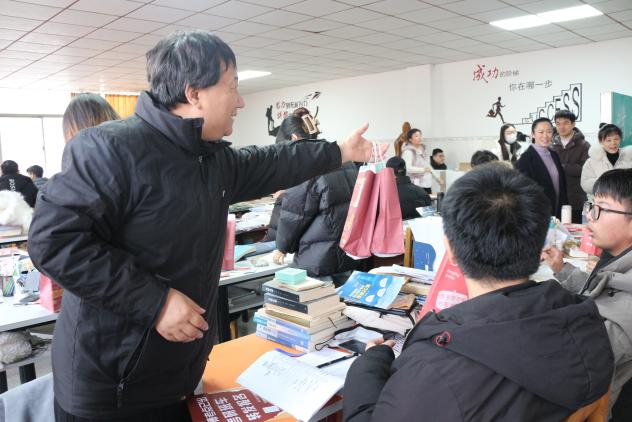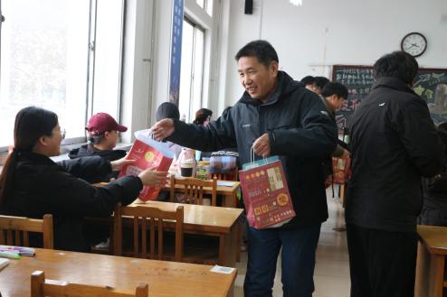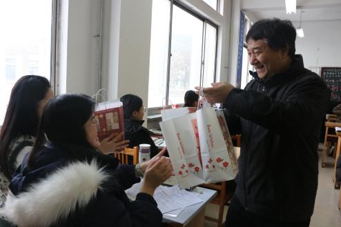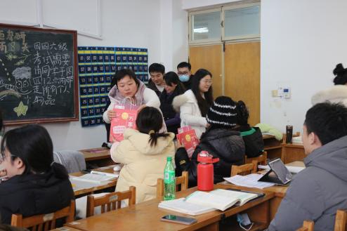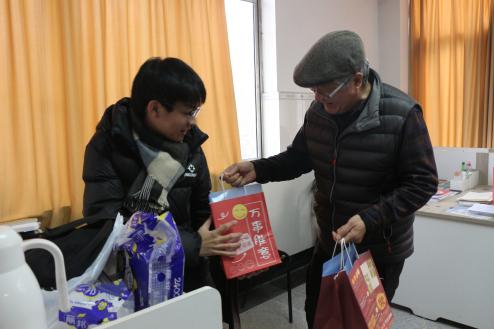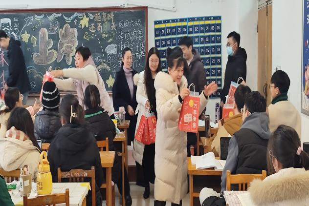 “天气寒冷,做好保暖”“祝成功上岸”“加油,坚持就是胜利”。走访期间,来自老师们简短的关怀与问候,对于不畏严寒、备考热情不减的考研学子而言,糖分很足,格外暖心。接送福袋的那份激动与幸福,伴着欢笑与浓浓的师生情,为冬日校园平添了一道亮丽温情的风景线。