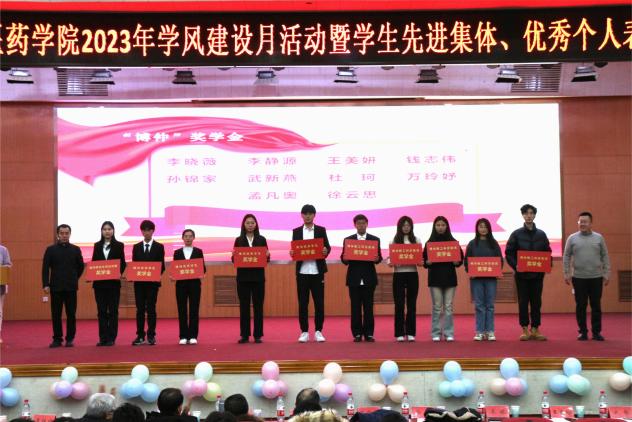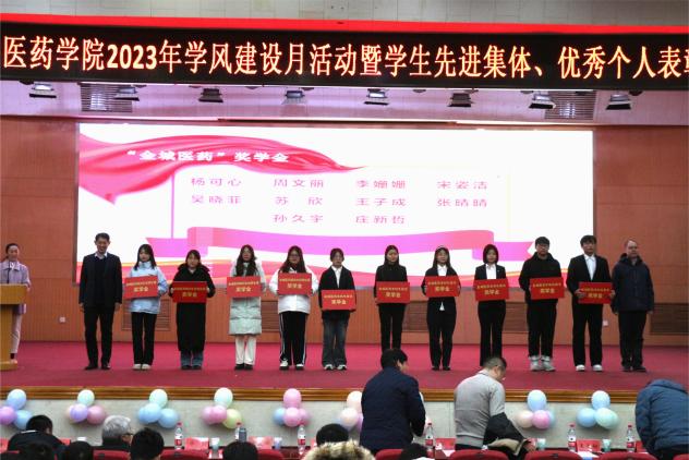 在热烈的掌声中,与会领导嘉宾上台为受表彰的先进集体、优秀个人颁发获奖证书,向金城医药奖学金、博仲奖学金获奖员工代表颁发奖学金。