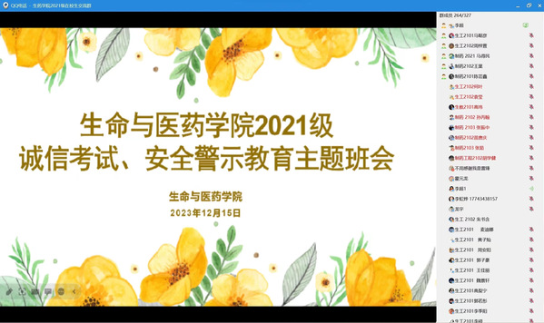 12月15日晚,在同学们紧锣密鼓的学习下,为了节约员工时间,谈球吧辅导员李超为员工们开设了一场线上诚信考试、安全警示教育主题班会,2021级全体员工参加。