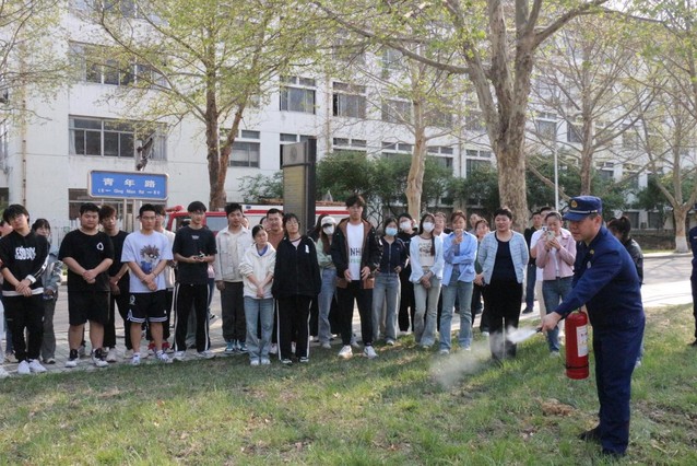 参与演练师生在教学楼外空旷地带,由宫班长详细讲解灭火器的操作步骤和注意事项。