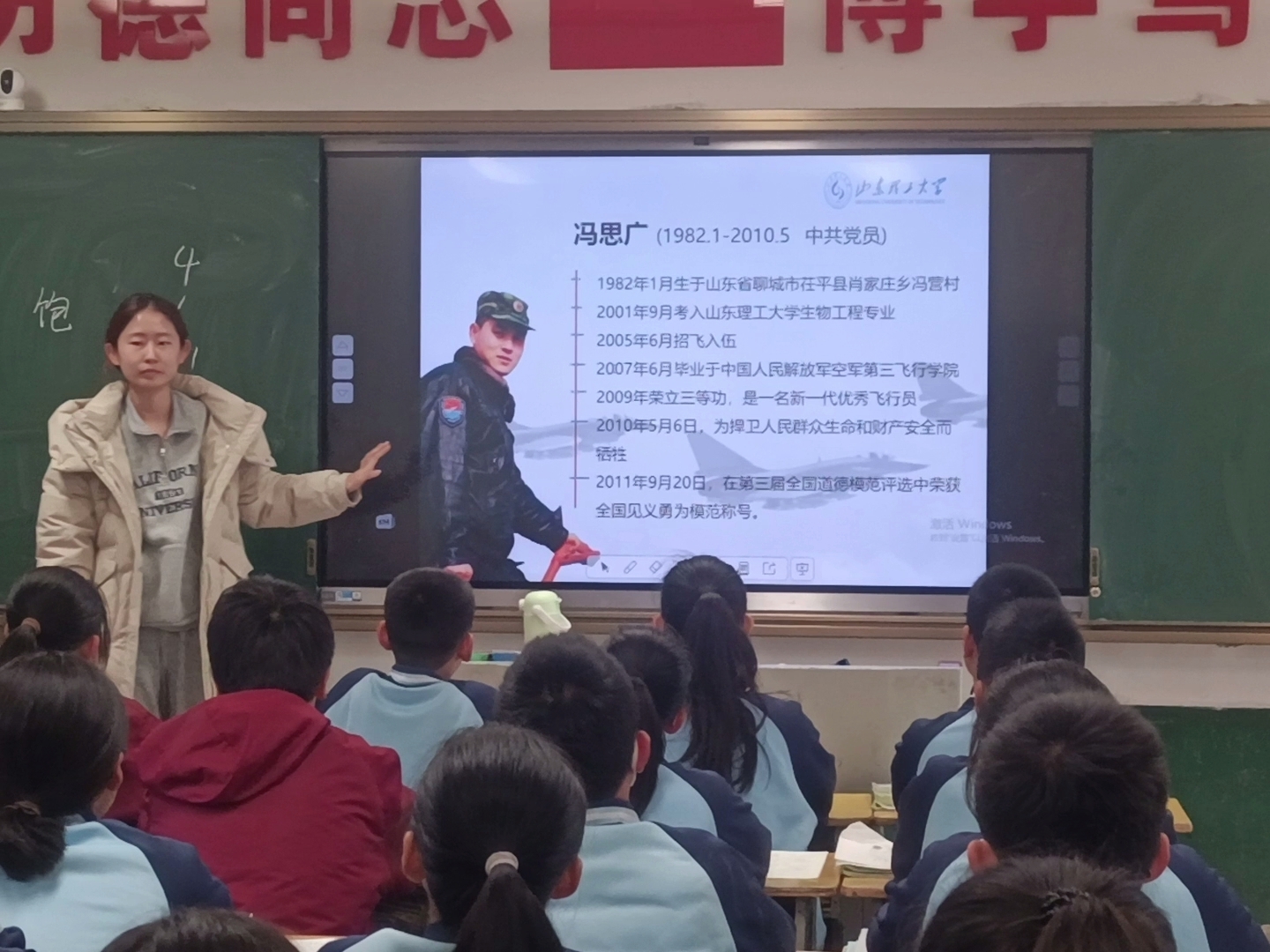 4月3日,第三届“冯思广班”于美琪、董淑钰在实习公司张店区第六中学召开主题班会宣讲冯思广精神,为初一三班的员工上了一堂生动的思政教育课。
