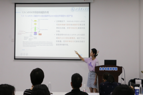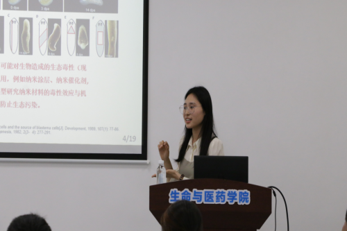 研究生谢文硕作了题为“CAPON对东亚三角涡虫神经再生及功能的调控机制研究”的报告。她以涡虫为研究对象,分析CAPON对涡虫神经再生的影响,并表示在今后将进一步探索CAPON影响涡虫神经再生的具体机制。