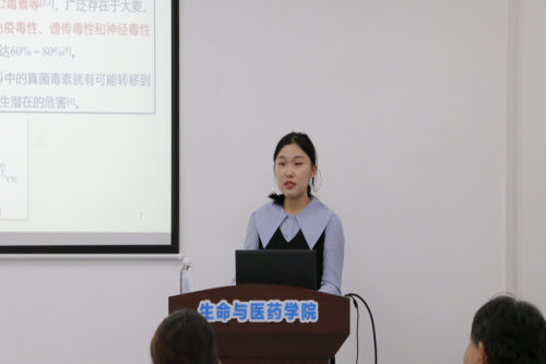 研究生于鹏飞作了题为“乳中典型真菌毒素污染物的生物传感分析方法研究”的报告。她的研究主要以纳米材料为载体,以核酸适配体为工具,构建光电化员工物传感器,开发出三种检测技术。她表示,后期将继续优化方法,将单一物质检测延伸至多种毒素的通用检测。
