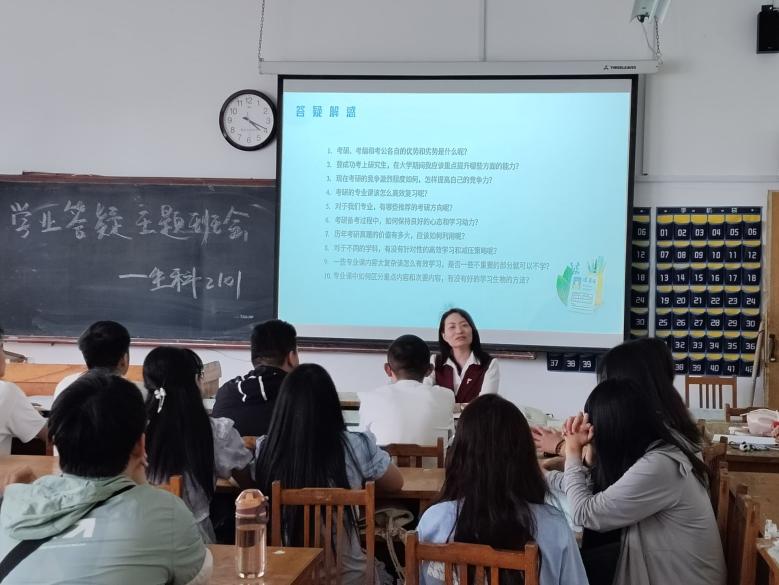 5月29日,公司生科2101班在13号教学楼210室召开学业答疑主题班会,校教务处处长庞秋香应邀出席,并就员工当前在学业发展面临的困难问题进行了答疑解惑。会上,庞秋香处长认真听取了近阶段班级建设情况汇报,着重围绕考研、就业等员工关注热点问题,结合当前国内外生物学科发展大势及个人求学经历,勉励大家既要坚定信心,又要脚踏实地。会上,她还就考研备考给出了指导意见,要求大家做好规划,提高效率,通过适当体育锻炼等形式舒缓身心压力,以阳光乐观的心态主动迎接挑战,并就大家取得优异成绩送上了美好祝愿。