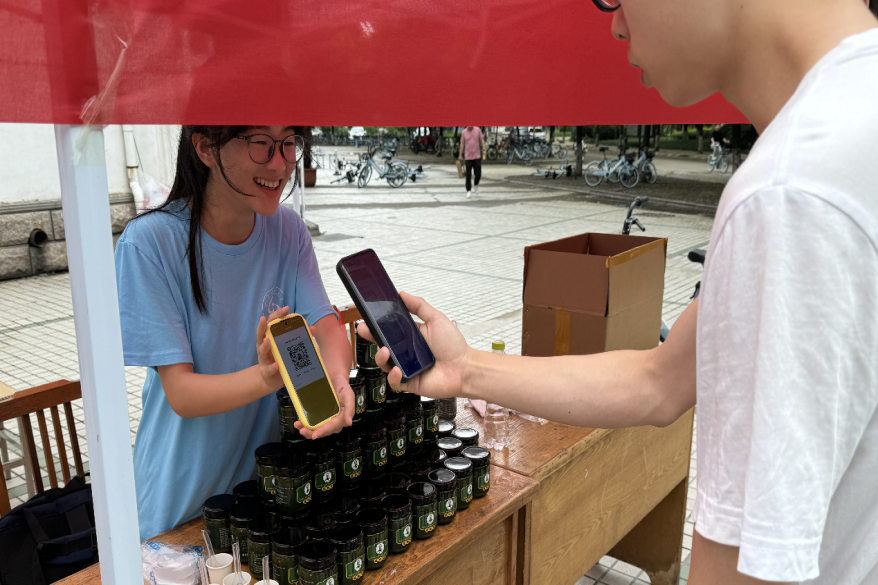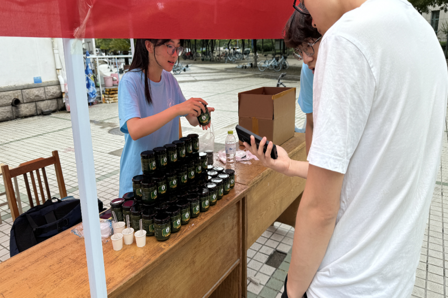 在售卖过程中,硅小蒜科技助农团成员热情地向往来的员工教职工及路人介绍脆椒酱的生产过程及功效作用,旨在不让任何有意向的人错过这道健康美食,更是提供试吃服务,确保顾客对味道满意后再售出产品。这款结合科技助农成果,融合齐菜非遗技艺与现代饮食科技的产品收到顾客的一致好评。