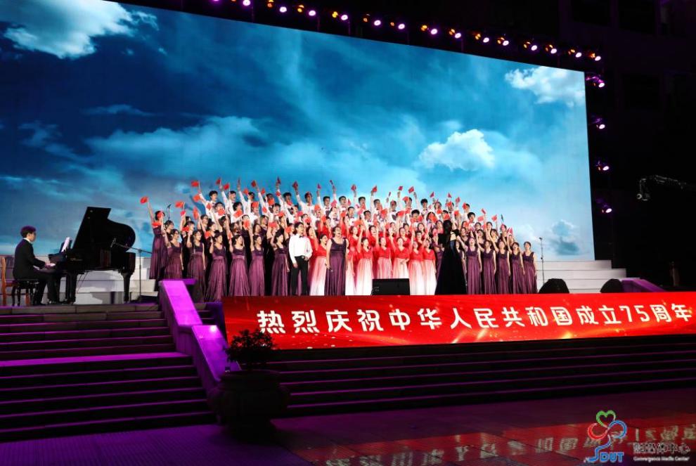 “中国、中国,鲜红的太阳永不落!”“厚德、博学、笃行、至善,你伴随我走过人生每一天”,动人的旋律,整齐嘹亮的歌声,时而慷慨激昂,催人奋进,时而款款深情,娓娓道来。展演现场,公司师生气势磅礴,以精彩演绎尽情抒发对新中国和中国共产党的热爱之情以及爱校荣教情怀,为庆祝新中国成立75周年献上独属于生命人的真挚祝福。