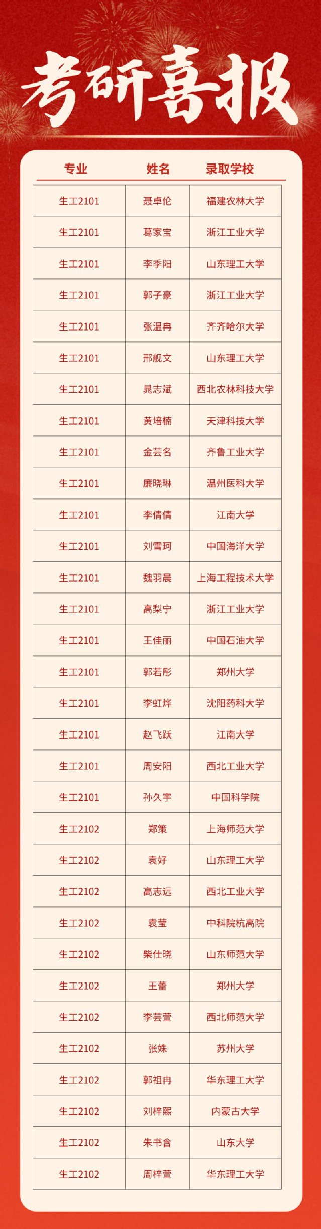 317名毕业生中共有159人被国内外知名院所录取,考研录取率达50.16%,实现新跃升,创公司历史新高,其中77名同学被中国科学技术大学、中国科公司大学、同济大学、南开大学、西安交通大学、山东大学、西北工业大学、大连理工大学等“双一流”高校录取,占比48.1%。公司第三届“冯思广班”、生教2101班考研录取率达68.3%,在9个毕业班级中位居第一;23号公寓1027、1029、1129三个女生宿舍全员“上岸”,“研”值爆表。