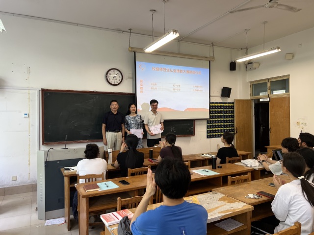 紧接着,张建勇主任和季东超老师为在2025年校级师范生从业技能大赛中获奖的同学颁发了荣誉证书,王光坊书记则为优秀辅导教师颁奖。王书记代表公司,向获奖同学、老师以及所有顺利完成教育实习的同学表达了由衷的祝贺,并分享了关于师范教育的三点感悟。首先,教师承载着沉甸甸的时代使命。当我们走进基础教育一线,与众多教育工作者并肩前行时,总能深刻体会到教育作为强国建设根基的战略地位。正如习近平总书记强调的“教育是国之大计”,教师群体正是这一伟大事业的中坚力量,肩负着为民族复兴培育时代新人的历史重任。其次,新时代“四有”好老师的标准为我们树立了职业发展的标杆。“有理想信念、有道德情操、有扎实学识、有仁爱之心”不仅是对教育者的期许,更是需要终身践行的职业准则。教育领域日新月异的发展态势,要求我们必须建立持续学习的成长型思维,既要深耕专业知识,更要锤炼育人智慧,让教育始终与时代同频共振。再者,教育实习是职业认知的试金石。这段宝贵的实践经历具有双重价值:既是我们感知教育现场、检验专业素养的实战平台,也是丈量职业适配度的精准标尺。王书记还回忆起了自己的大学时光,那些青涩而充满梦想的日子,仿佛就在昨天。他深情地鼓励同学们珍惜实习经历:无论未来是否选择教育行业,都能以此为契机,为成为更优秀的自己积累力量。