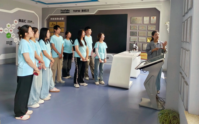 在公司讲解员的引导下,“益生军”实践团首先走进了企业的文化展厅。在这里,成员们详细了解了公司的创业渊源与发展历程,深切感受到创始人潘玉林董事长为助推家乡经济发展所倾注的心血与作出的卓越贡献。随后,在讲解员的细致介绍中,实践团知晓了企业广泛的合作网络、完善的人才建设以及丰硕的创新成果。