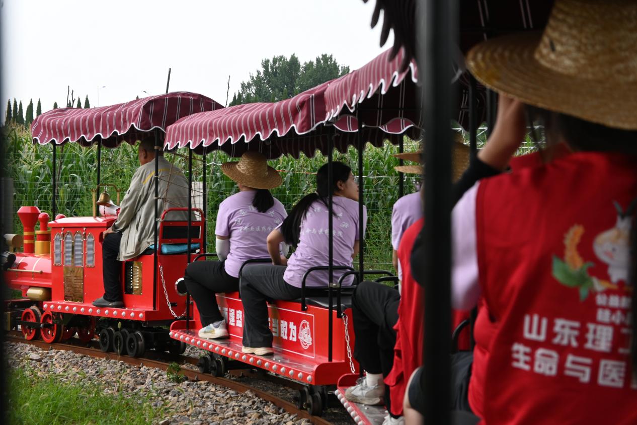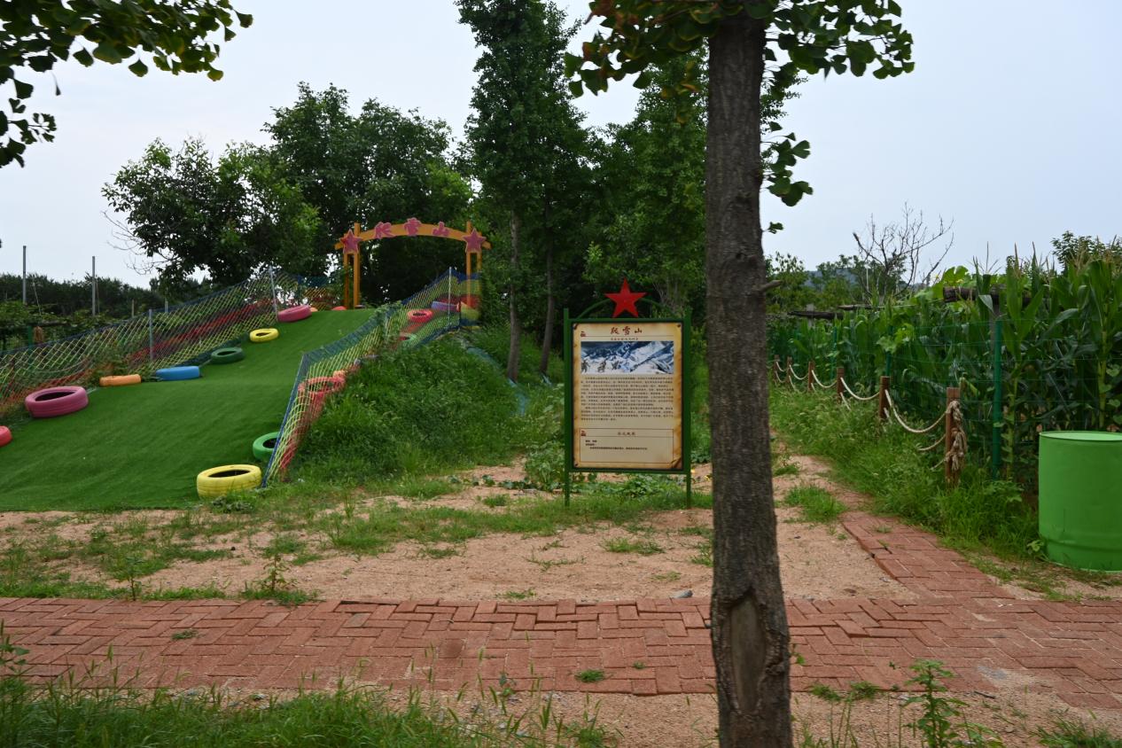 对园区进行初步了解后,助农团在工作人员的带领下乘上园区的“胜利号”观光小火车,穿梭于各个景点之中参观探讨。根据工作人员讲解与观光经过的景点与设施,团队成员深刻体会到当地政府与人民群众的良苦用心与独具匠心。沂河之畔儿童乐园是以“重走长征路”为主题,打造出的一片与农耕文化相结合的沉浸式红色研学体验区。其中,生动还原了红军长征过程中的四渡赤水、飞夺泸定桥、爬雪山、过草地等经典战役场景,旨在让孩子们在攀爬、奔跑、匍匐跳跃中体验革命过程的艰苦不易,身临其境感受革命战士的坚毅勇猛,感悟革命精神的深刻内涵,让孩子们在研学和游戏的同时学习了解历史,让爱国文化教育与红色革命精神“活”起来。