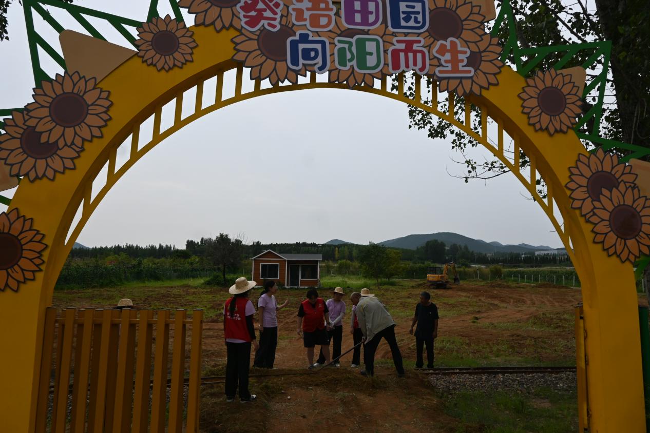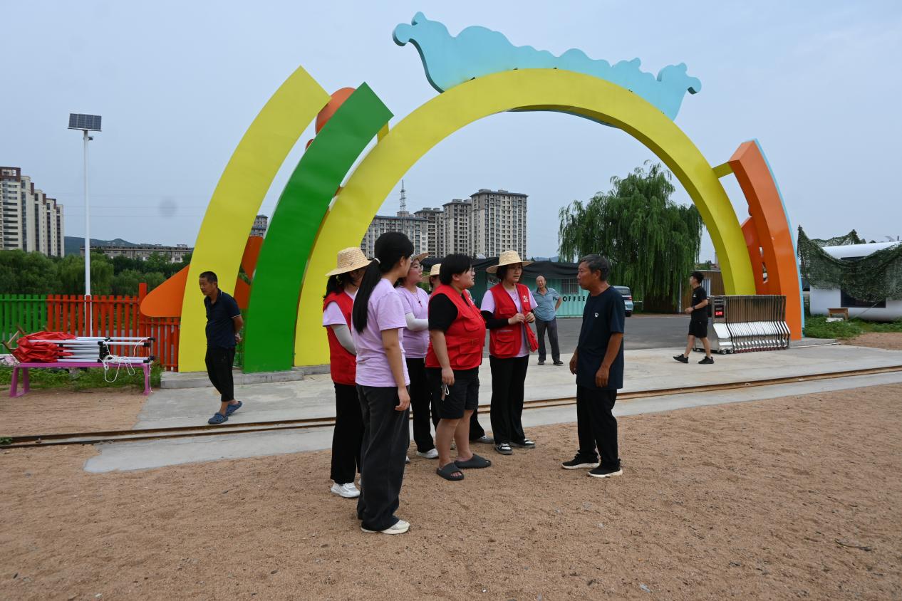 步入沂河之畔,园区负责人与村支部书记向助农团成员简单介绍了园区布景与娱乐设施。成员们据此了解到,位于沂河岸边的沂河之畔儿童乐园,以长征故事和农耕文化为主题,已经吸引了众多家庭前来体验,在游玩过程中能够让孩子们化身“小红军”,在沉浸式体验游乐项目的过程中学习党史,并于研学和农耕实践活动中感受革命精神。