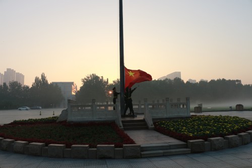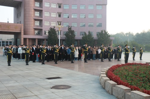 清晨时分,师生代表齐聚广场,列队整齐。伴随着雄壮激昂的《义勇军进行曲》,鲜艳的五星红旗在国旗护卫队旗手的护卫下冉冉升起,迎风飘扬。全体师生面向国旗行注目礼,深切表达对祖国的无限热爱与崇高敬意。