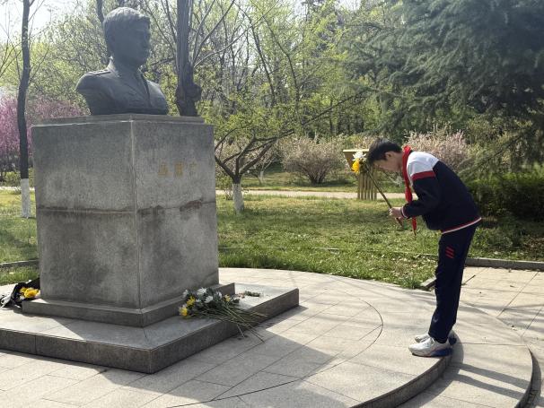 宣讲结束后,全体师生面向冯思广烈士纪念雕塑肃立默哀一分钟,表达对英雄的深切缅怀和崇高敬意。随后,全体同学依次手捧鲜花,缓步走向纪念雕塑,鞠躬致敬,将鲜花郑重摆放在雕塑基座前。